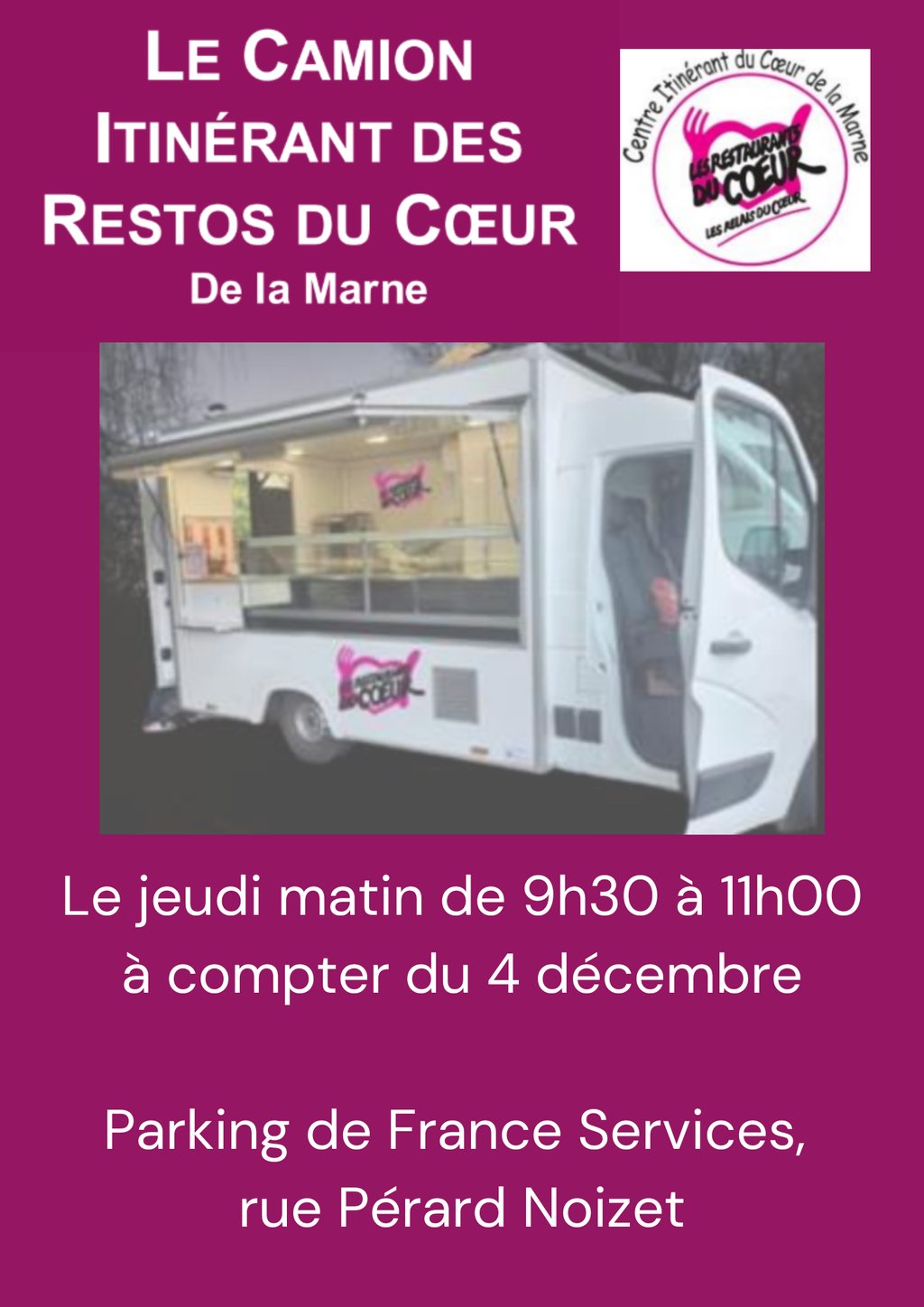 Le camion itinérant des Restos du cœur sera présent sur le parking de France Services (rue Pérard Noizet) tous les jeudis matin à compter du 4 décembre de 9h30 à 11h00.